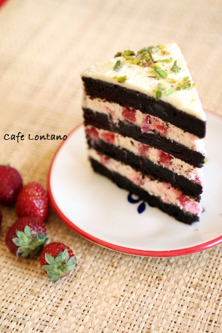 Bu tasarım yolculuğunda pastalarda kullanmak üzere çok yoğun, çikolatalı ve hafif ıslak bir kek elde ettim. Çıkış noktamdaki devil’s food cake, varış noktamda biraz evrilmiş ve türkleşmiş olarak karışıma çıktı. Artık bir çok pasta için bu keki kullanıyorum. Aşağıdaki ölçülerle iki kek pişirip, 4 katlı bir pasta yapımı için kullanıyorum. Pasta olarak bugün vereceğim versiyon ise bu kekin çilekle buluşması ve yaz mevsiminin güzelliğine güzellik katması.